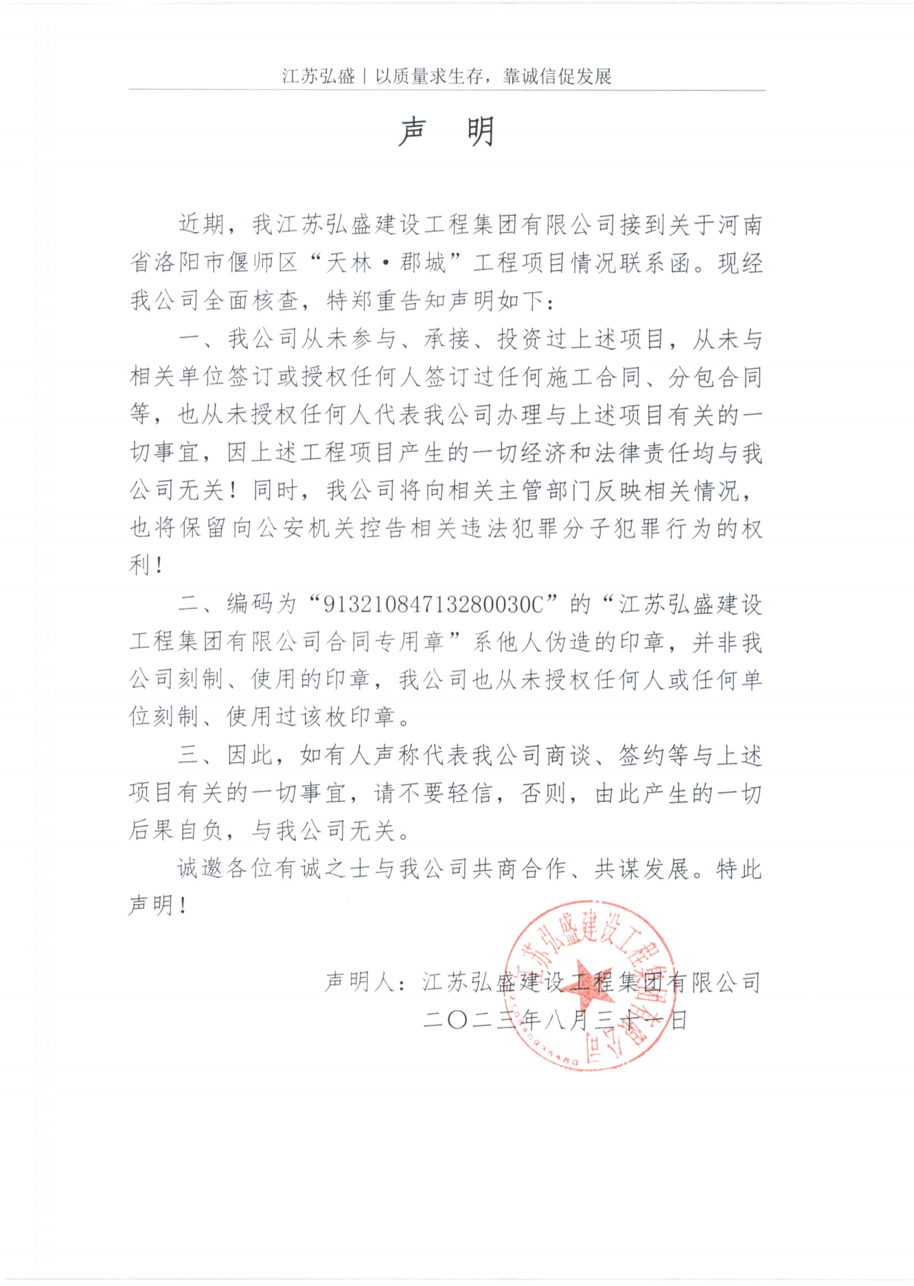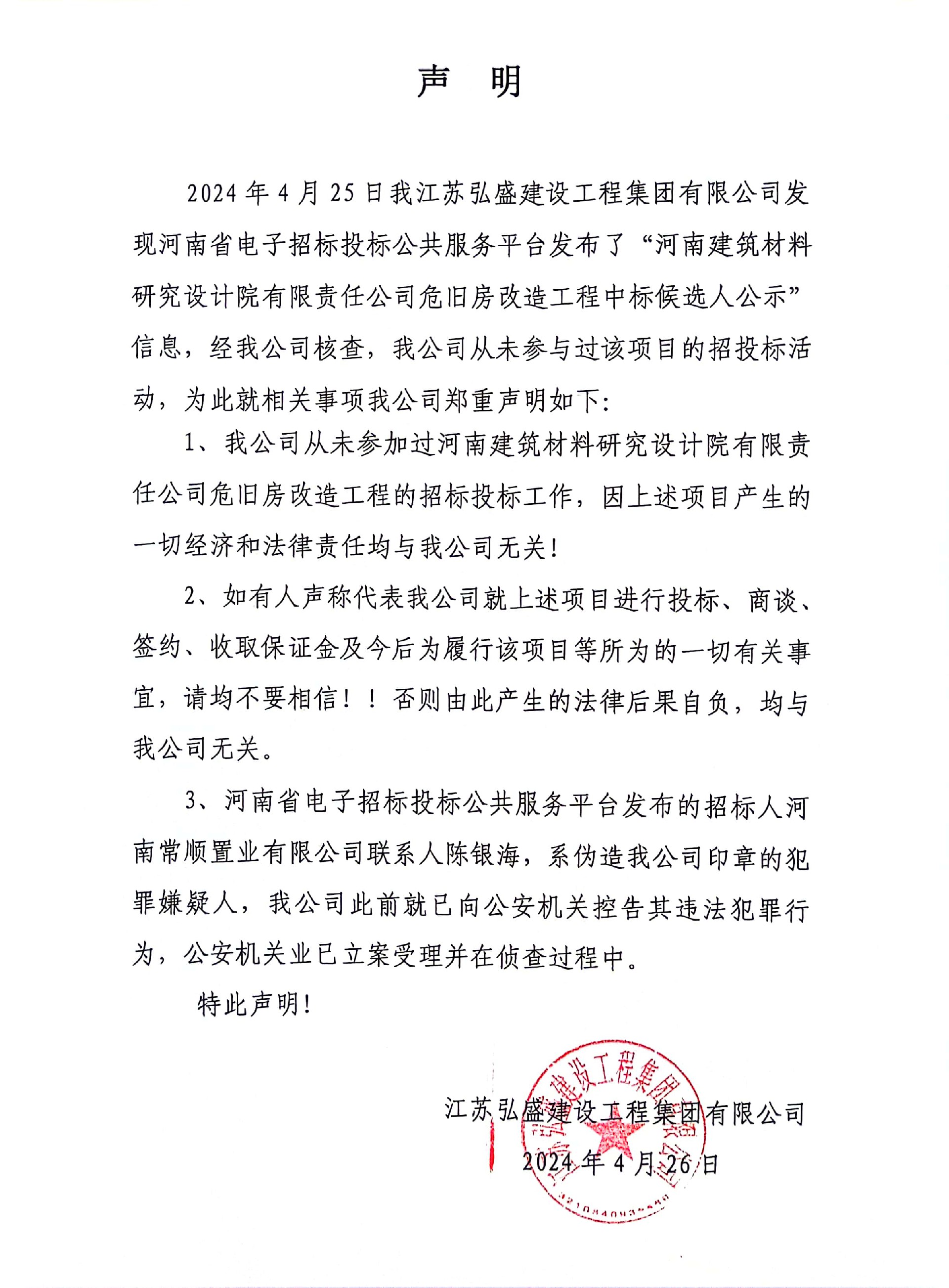 近期,我江蘇弘盛建設工程集團有限公司接到關于河南省鶴壁市“鴻城凱歌北區”工程項目情況的咨詢。現經我公司全面核查,特鄭重告知聲明如下:一、我公司從未參與、承接、投資過上述項目,從未與相關單位簽訂過任何施工合同、分包合同等,···